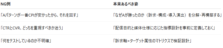 最初の検証では、横軸の「訴求軸」のみを変え、他の要素は揃えると、差分が明確に出て改善の起点になります。